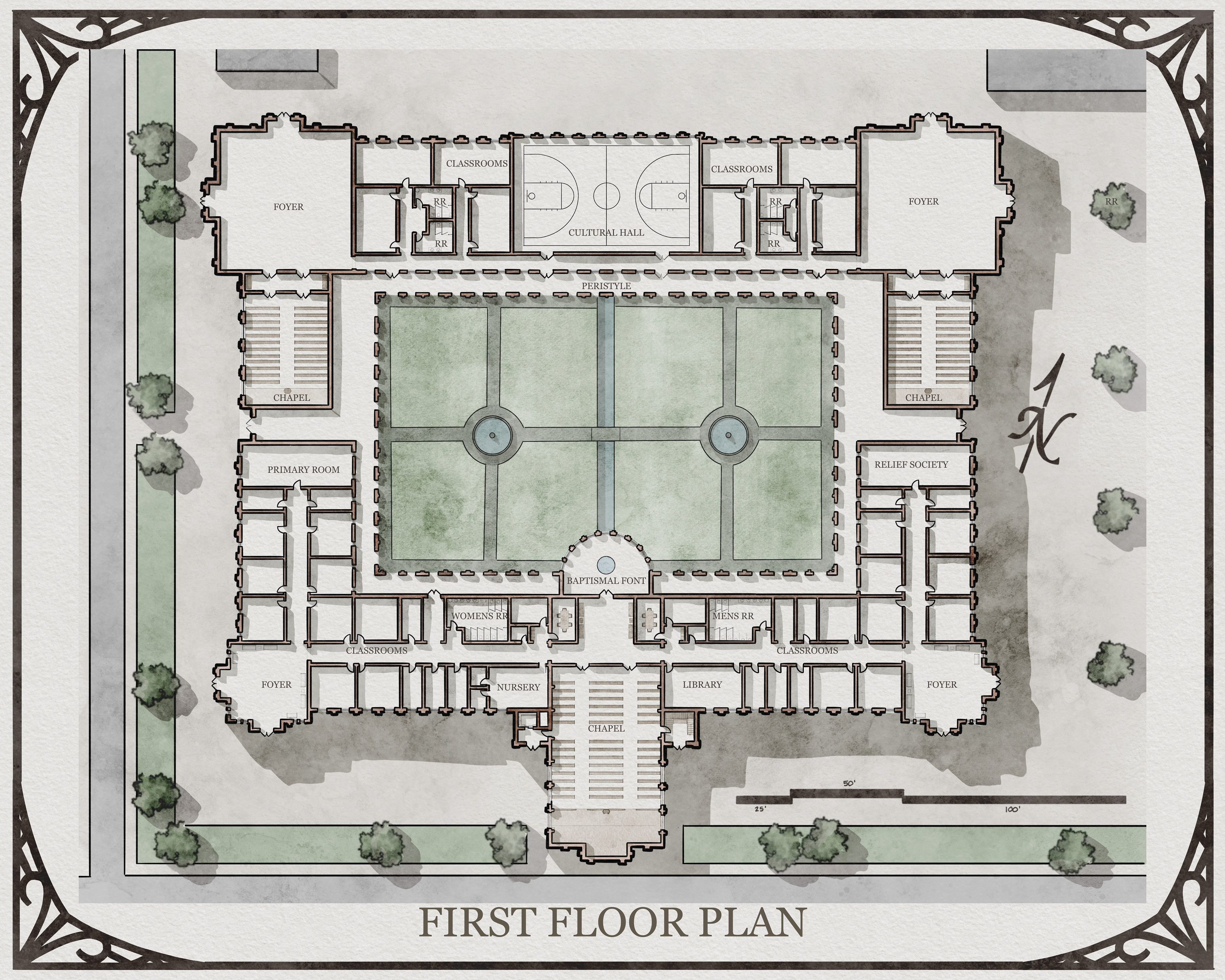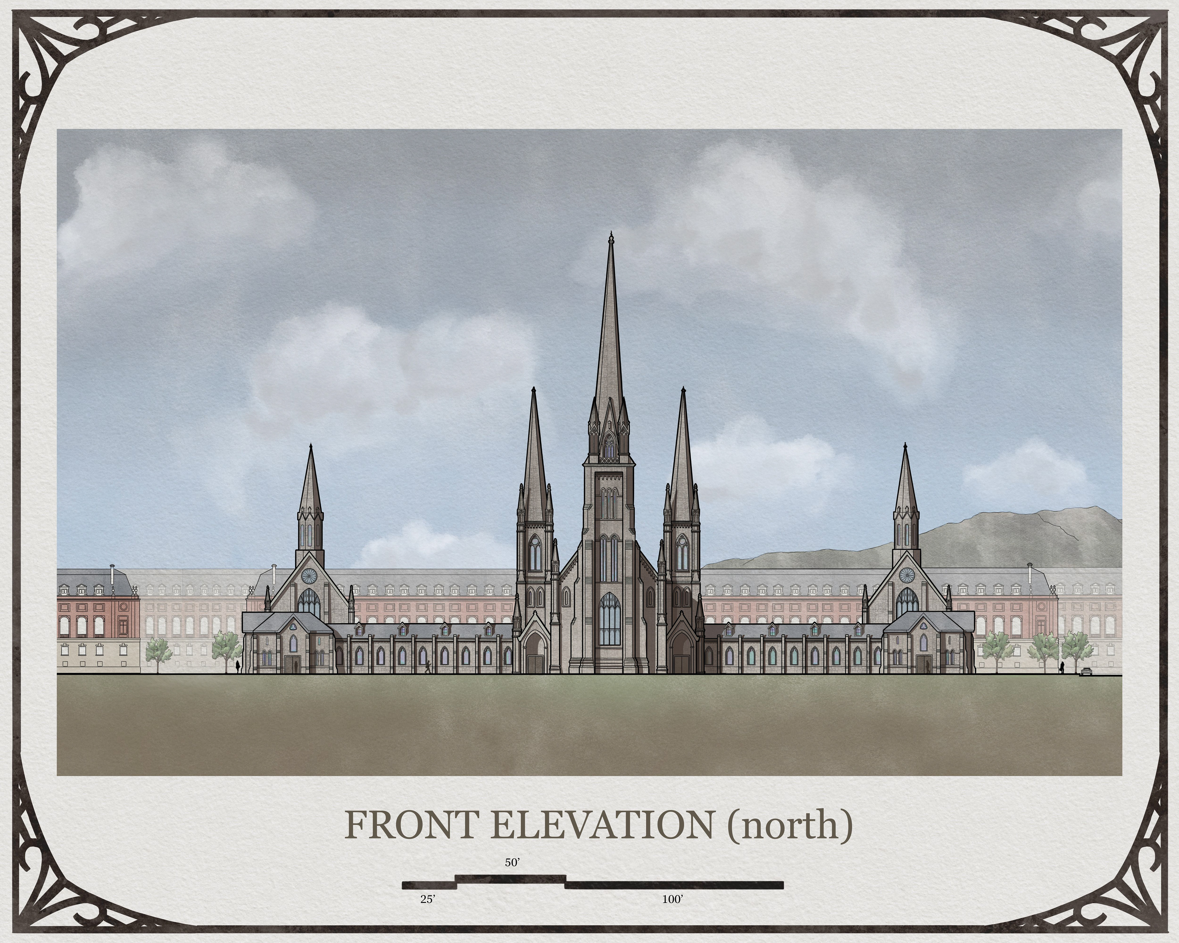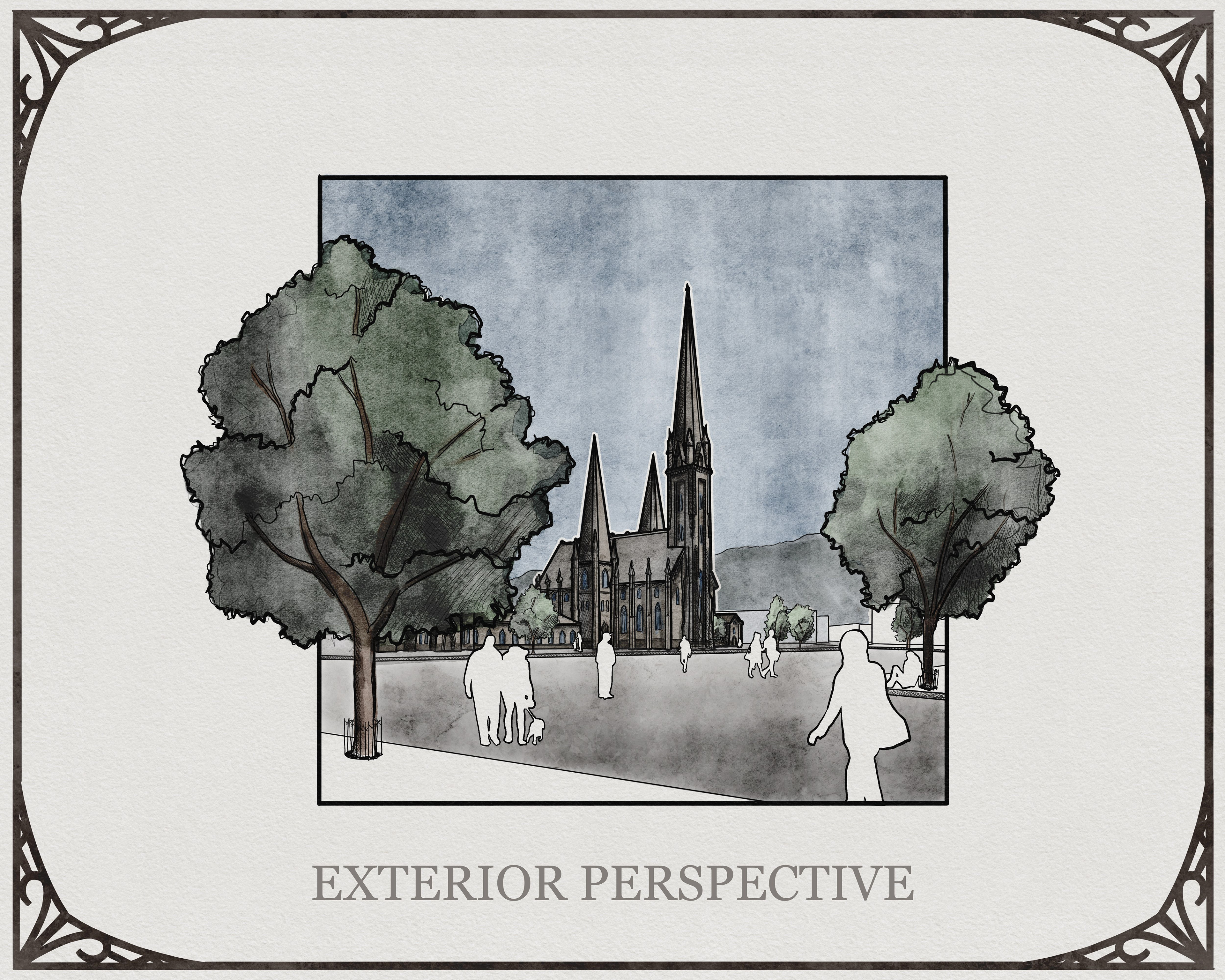 For this project I was challenged with designing a religious building to go on an extension of UVU campus in Vineyard, Utah. I choose to Design a LDS meeting house for Sunday worship and an institute building. This was a solo project. I modeled this project in Revit then finished it in Procreate.